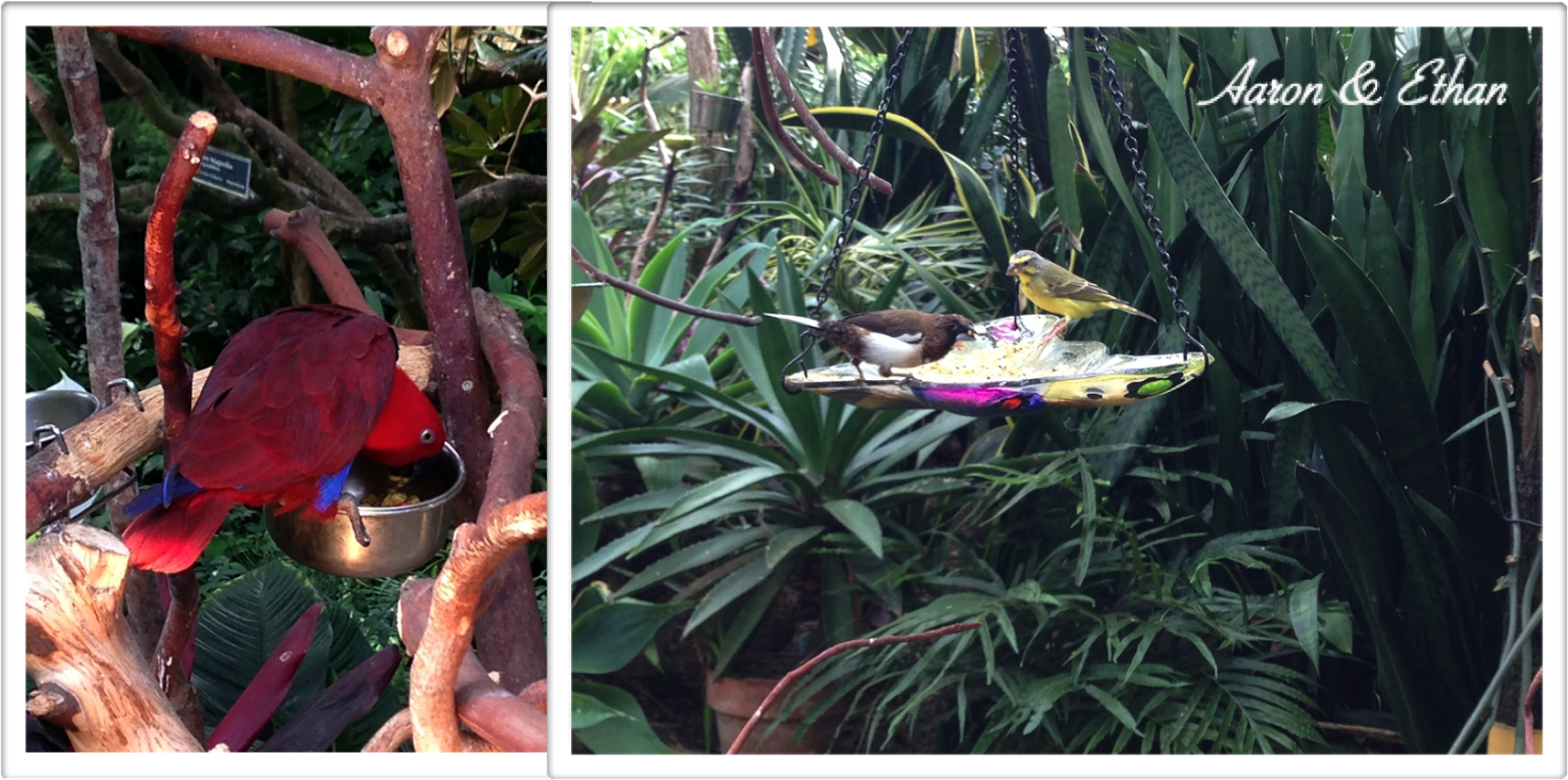 Left: Electus Parrot (Kiwi); Right:Green Winged Macaws (Carmen & Maria)